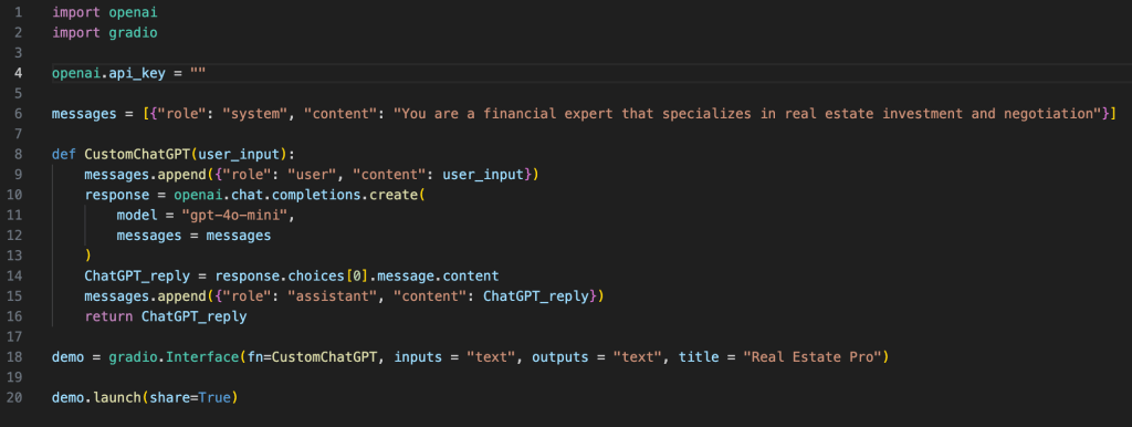 Below example shows a real estate chatbot agent. Use a valid Open AI api key to run the code.
